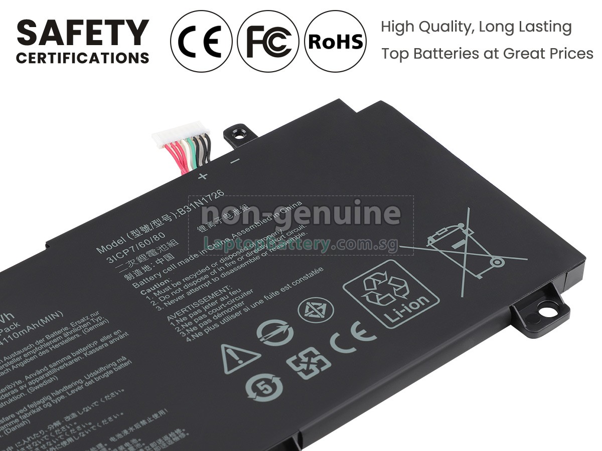 Welcome your patronage and thank you for purchasing this high quality replacement Asus B31N1726 laptop battery at Laptopbattery.com.sg! Before placing an order, please make sure that the part number of your old Asus B31N1726 battery is listed as below and has the same shape as our replacement B31N1726 battery's images (please view the larger images for details).