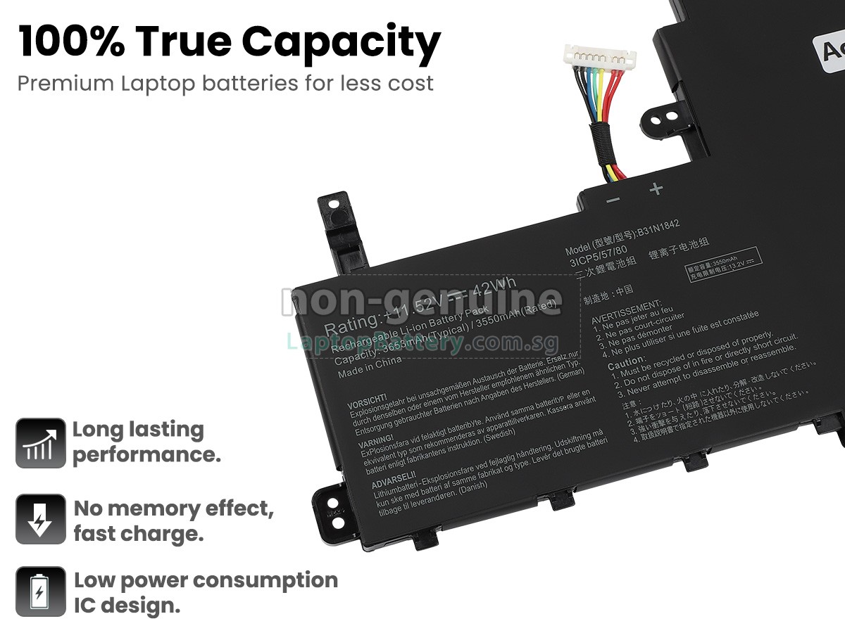 Welcome your patronage and thank you for purchasing this high quality replacement Asus B31N1842 laptop battery at Laptopbattery.com.sg! Before placing an order, please make sure that the part number of your old Asus B31N1842 battery is listed as below and has the same shape as our replacement B31N1842 battery's images (please view the larger images for details).