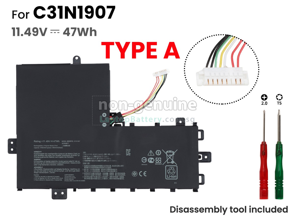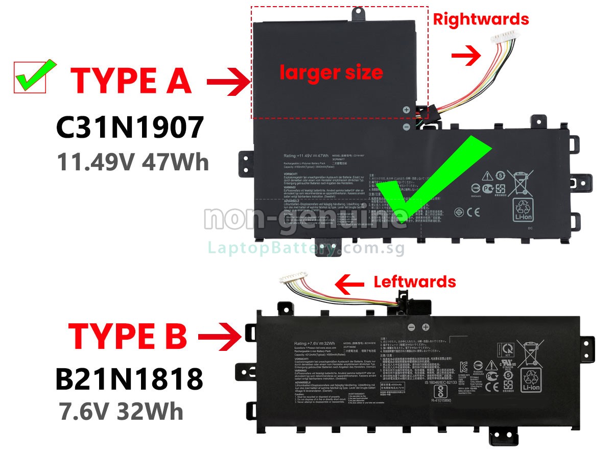 Welcome your patronage and thank you for purchasing this high quality replacement Asus C31N1907 laptop battery at Laptopbattery.com.sg! Before placing an order, please make sure that the part number of your old Asus C31N1907 battery is listed as below and has the same shape as our replacement C31N1907 battery's images (please view the larger images for details).