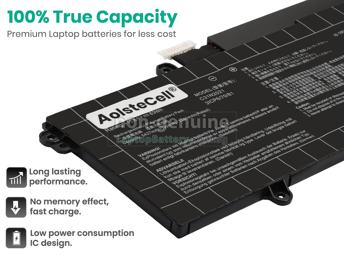 Welcome your patronage and thank you for purchasing this high quality replacement Asus C31N2021(3ICP6/70/81) laptop battery at Laptopbattery.com.sg! Before placing an order, please make sure that the part number of your old Asus C31N2021(3ICP6/70/81) battery is listed as below and has the same shape as our replacement C31N2021(3ICP6/70/81) battery's images (please view the larger images for details).