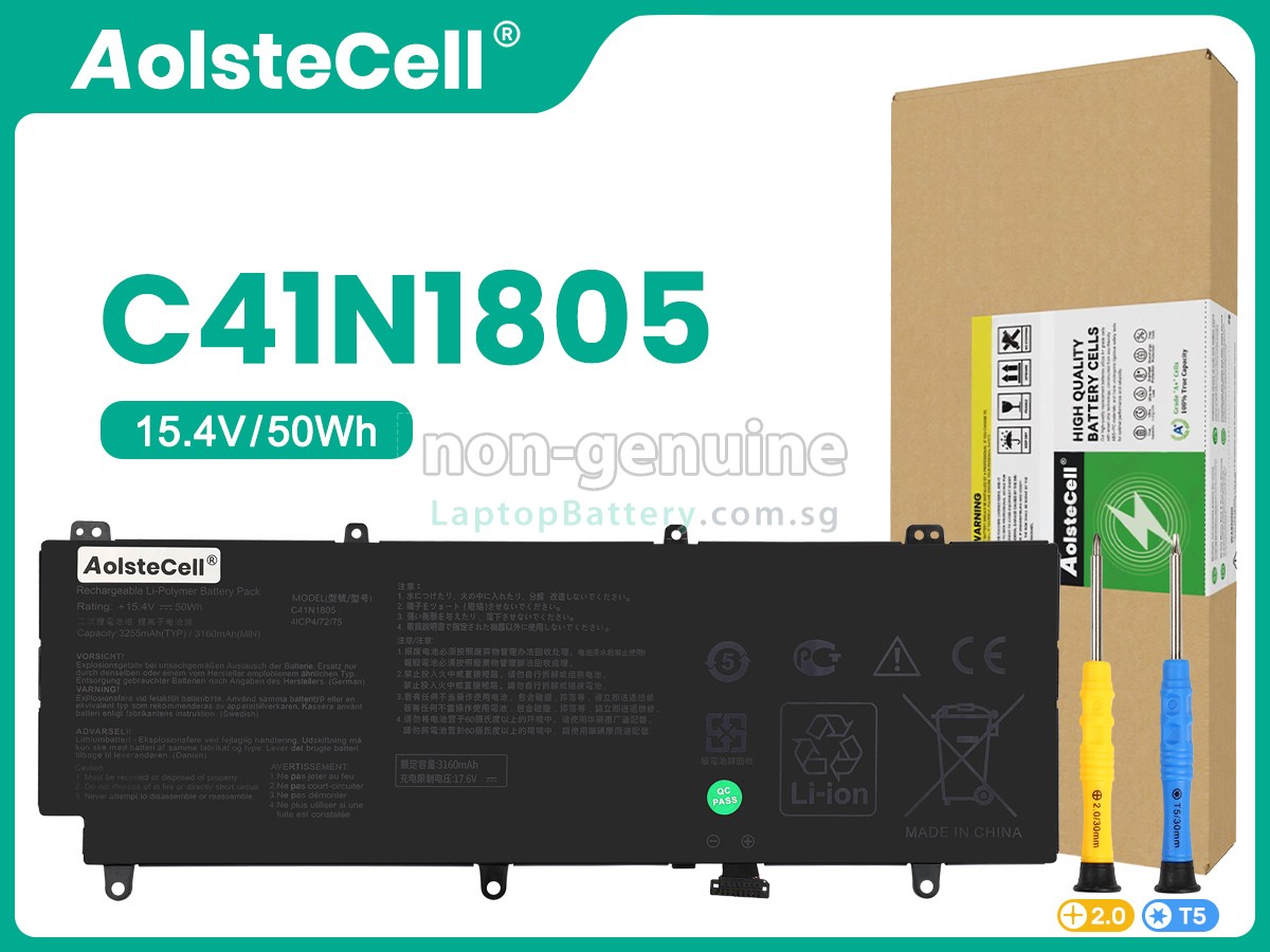 Welcome your patronage and thank you for purchasing this high quality replacement Asus C41N1805 laptop battery at Laptopbattery.com.sg! Before placing an order, please make sure that the part number of your old Asus C41N1805 battery is listed as below and has the same shape as our replacement C41N1805 battery's images (please view the larger images for details).