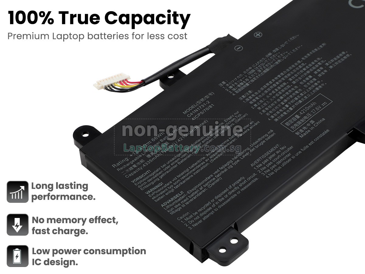 Buy with confidence! Our Website is your source for high quality Asus laptop batteries. This brand new 66Wh(4 cells) replacement Asus G731GV Li-Polymer battery is made with high quality cells from Samsung. Each replacement battery for Asus G731GV laptop has been tested on the Asus system before being dispatched and is 100% compatible with the original manufacturer's specification. When you buy our replacement Asus G731GV battery, you're buying trust!