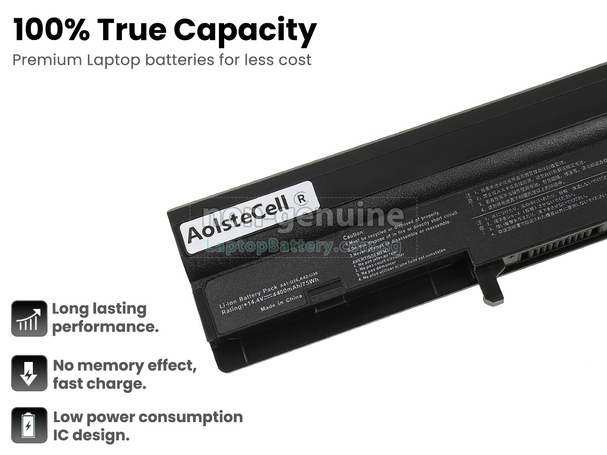 Buy with confidence! Our Website is your source for high quality Asus laptop batteries. This brand new 4400mAh(8 cells) replacement Asus U36JC Li-ion battery is made with high quality cells from Samsung. Each replacement battery for Asus U36JC laptop has been tested on the Asus system before being dispatched and is 100% compatible with the original manufacturer's specification. When you buy our replacement Asus U36JC battery, you're buying trust!