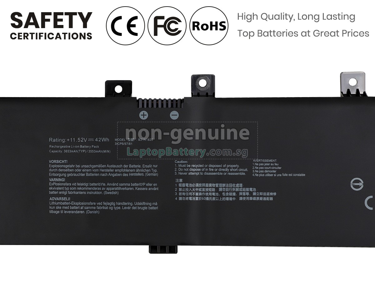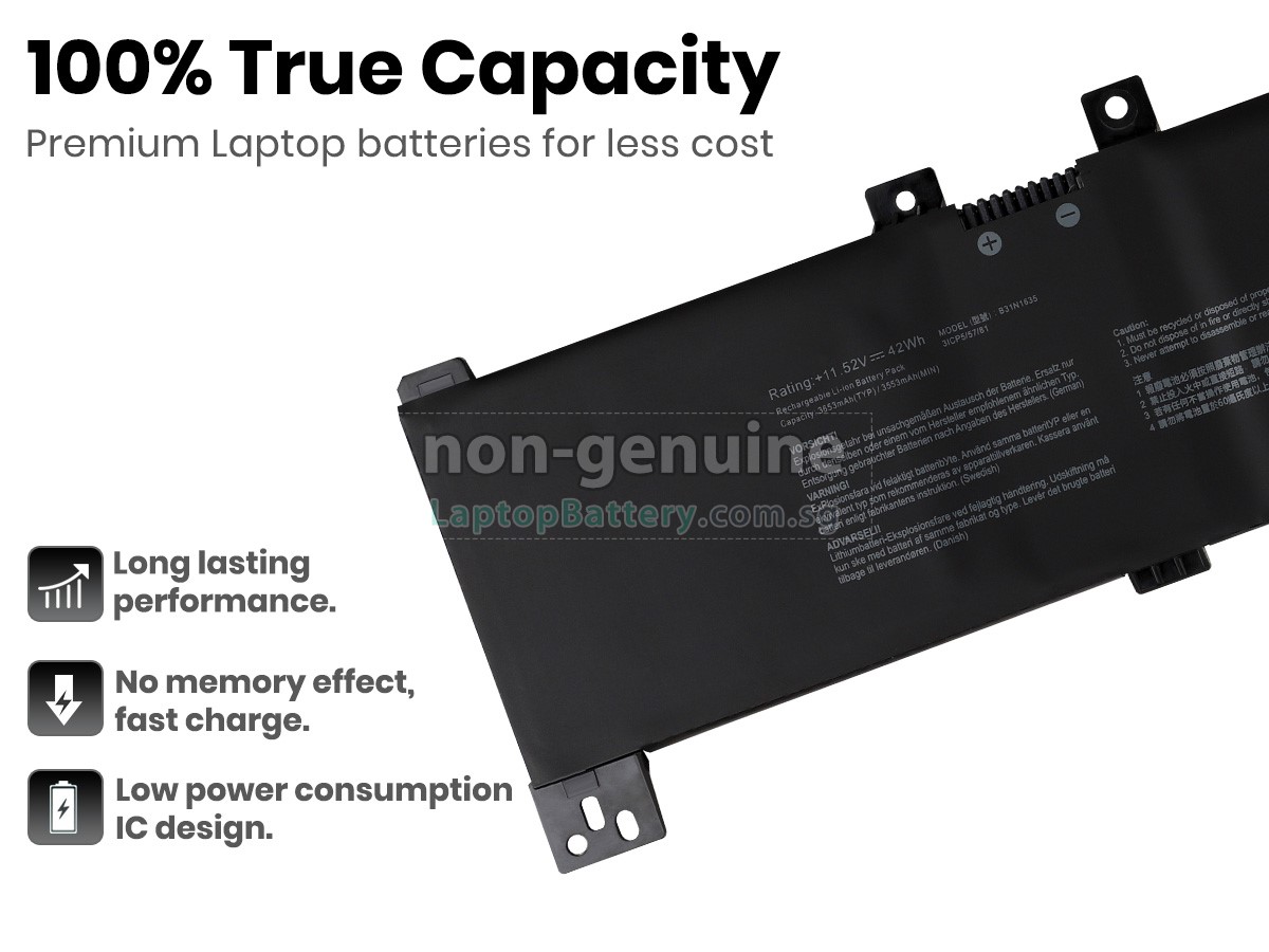 Buy with confidence! Our Website is your source for high quality Asus laptop batteries. This brand new 42Wh(3 cells) replacement Asus VivoBook F705UB Li-Polymer battery is made with high quality cells from Samsung. Each replacement battery for Asus VivoBook F705UB laptop has been tested on the Asus system before being dispatched and is 100% compatible with the original manufacturer's specification. When you buy our replacement Asus VivoBook F705UB battery, you're buying trust!