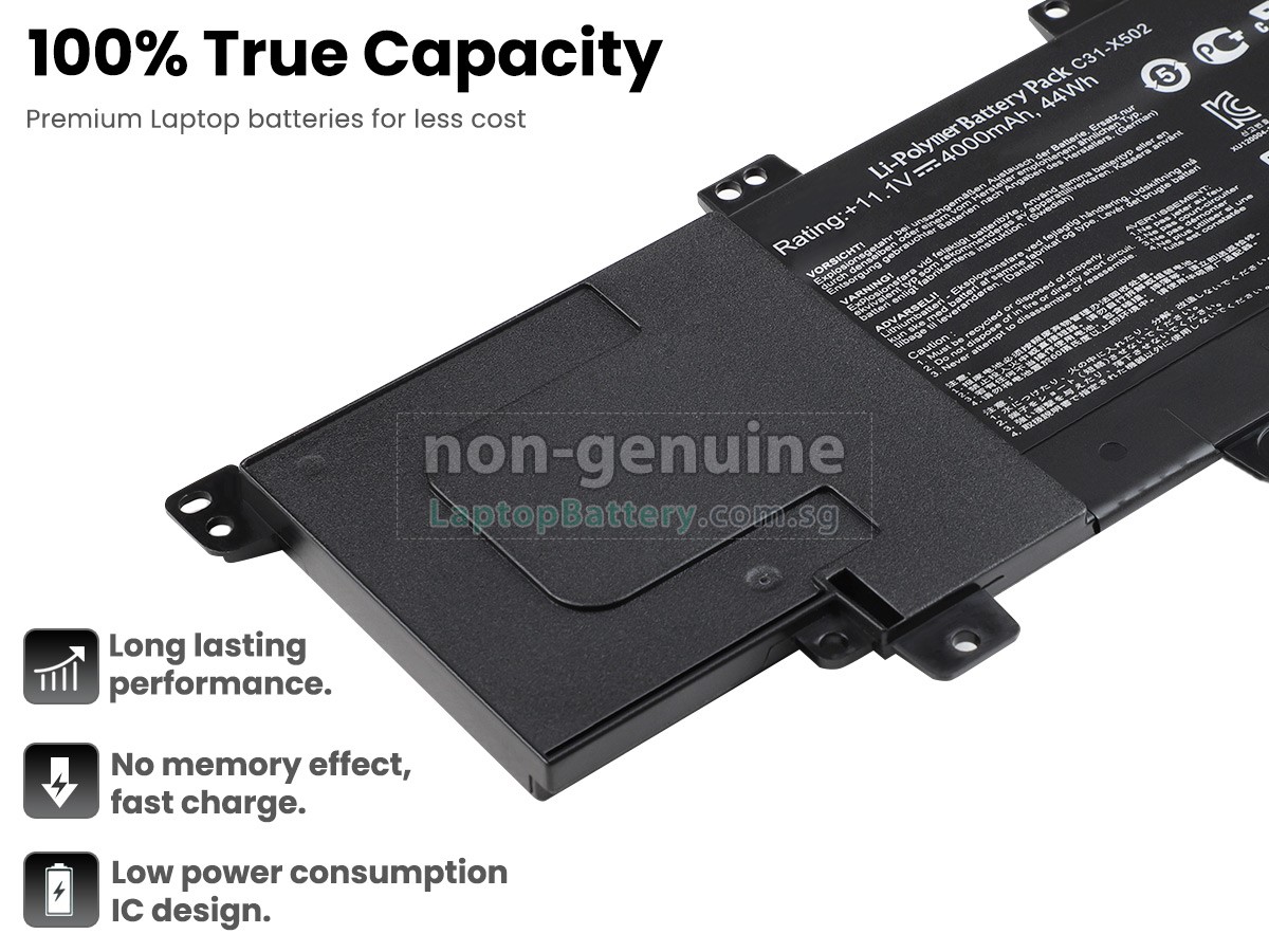 Welcome your patronage and thank you for purchasing this high quality replacement Asus X502C laptop battery at Laptopbattery.com.sg! Before placing an order, please make sure that the part number of your old Asus X502C battery is listed as below and has the same shape as our replacement X502C battery's images (please view the larger images for details).