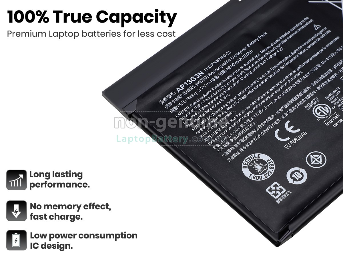 Buy with confidence! Our Website is your source for high quality Acer laptop batteries. This brand new 6800mAh(2 cells) replacement Acer AP13G3N Li-Polymer battery is made with high quality cells from Samsung. Each replacement battery for Acer AP13G3N laptop has been tested on the Acer system before being dispatched and is 100% compatible with the original manufacturer's specification. When you buy our replacement Acer AP13G3N battery, you're buying trust!