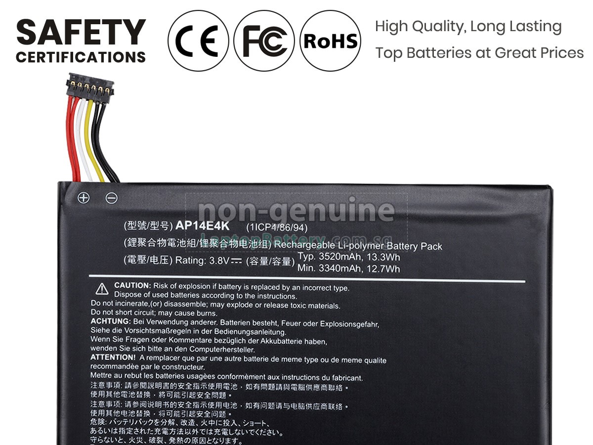 Welcome your patronage and thank you for purchasing this high quality replacement Acer AP14E4K(1ICP4/86/94) laptop battery at Laptopbattery.com.sg! Before placing an order, please make sure that the part number of your old Acer AP14E4K(1ICP4/86/94) battery is listed as below and has the same shape as our replacement AP14E4K(1ICP4/86/94) battery's images (please view the larger images for details).
