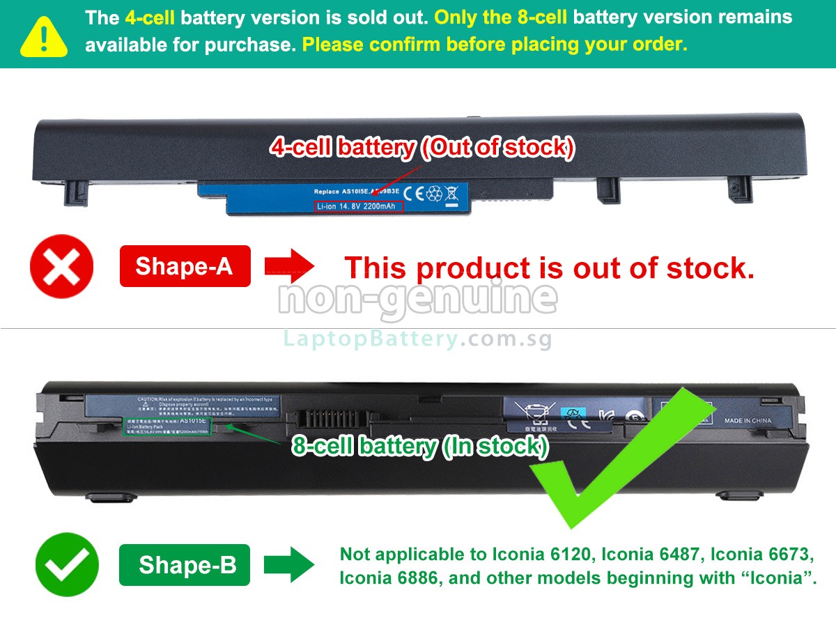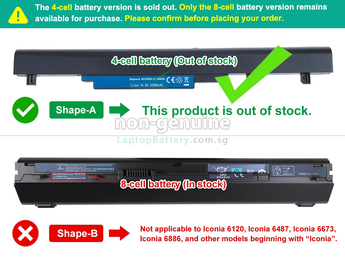 Welcome your patronage and thank you for purchasing this high quality replacement Acer Iconia 6673 laptop battery at Laptopbattery.com.sg! Before placing an order, please make sure that the part number of your old Acer Iconia 6673 battery is listed as below and has the same shape as our replacement Iconia 6673 battery's images (please view the larger images for details).