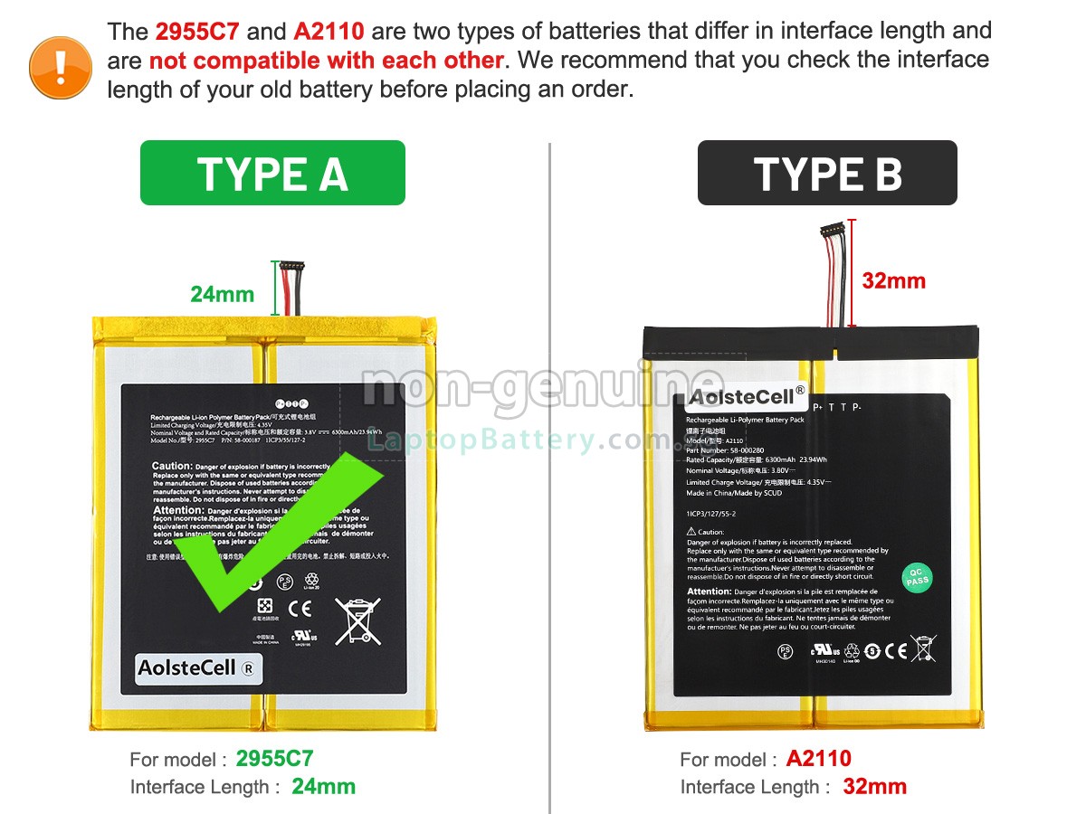 A: First, find out the part number of your old battery or the model name of your laptop (e.g. 'Amazon A2110') and match with our product compatibility table. Second, please compare the old battery with our product images to make sure their shapes are the same. Lastly, check the voltage (rating) is the same as the old one. For more details please click How to find one correct battery for my laptop?