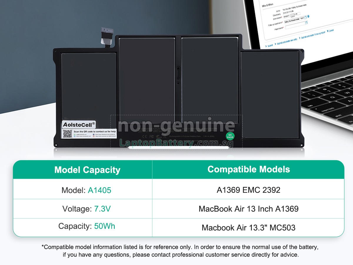 Welcome your patronage and thank you for purchasing this high quality replacement Apple A1369 laptop battery at Laptopbattery.com.sg! Before placing an order, please make sure that the part number of your old Apple A1369 battery is listed as below and has the same shape as our replacement A1369 battery's images (please view the larger images for details).