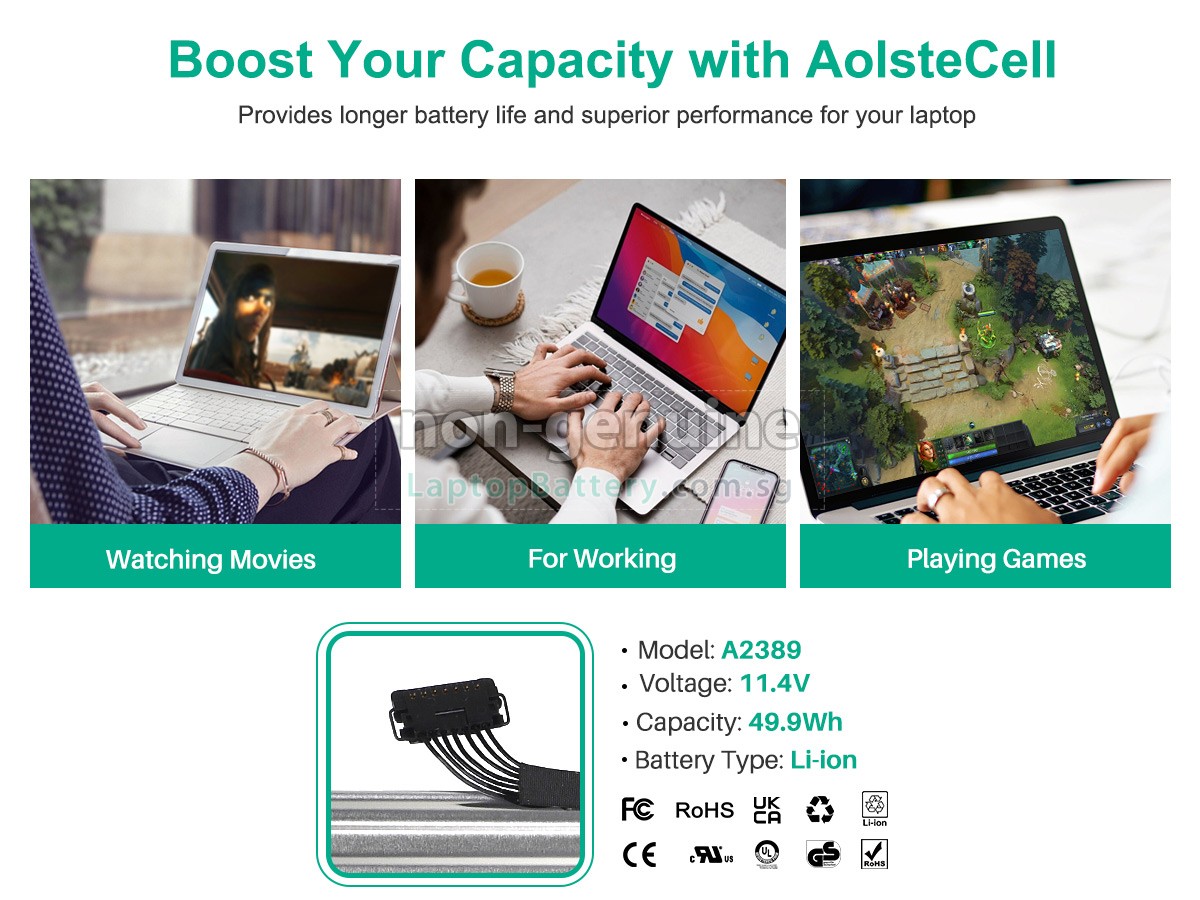 Welcome your patronage and thank you for purchasing this high quality replacement Apple A2337 EMC 3598 laptop battery at Laptopbattery.com.sg! Before placing an order, please make sure that the part number of your old Apple A2337 EMC 3598 battery is listed as below and has the same shape as our replacement A2337 EMC 3598 battery's images (please view the larger images for details).
