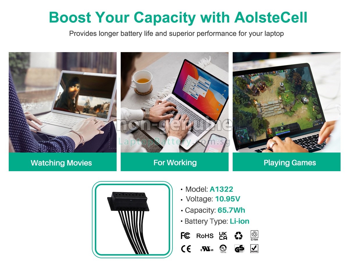 Welcome your patronage and thank you for purchasing this high quality replacement Apple MacBook Pro 13" MB990CH/A laptop battery at Laptopbattery.com.sg! Before placing an order, please make sure that the part number of your old Apple MacBook Pro 13" MB990CH/A battery is listed as below and has the same shape as our replacement MacBook Pro 13" MB990CH/A battery's images (please view the larger images for details).