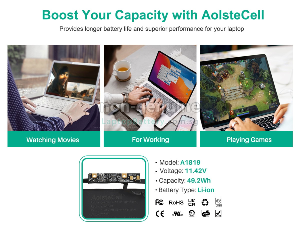 A: First, find out the part number of your old battery or the model name of your laptop (e.g. 'Apple MacBook Pro Core I5 3.1 13 inch TOUCH A1706(Mid 2017)') and match with our product compatibility table. Second, please compare the old battery with our product images to make sure their shapes are the same. Lastly, check the voltage (rating) is the same as the old one. For more details please click How to find one correct battery for my laptop?