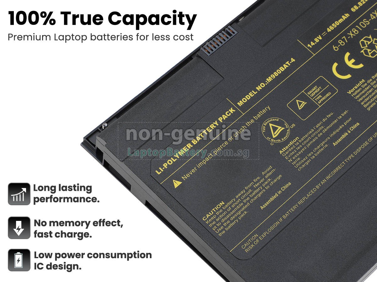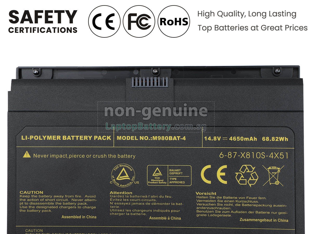 Welcome your patronage and thank you for purchasing this high quality replacement Clevo 6-87-X810S-4X51 laptop battery at Laptopbattery.com.sg! Before placing an order, please make sure that the part number of your old Clevo 6-87-X810S-4X51 battery is listed as below and has the same shape as our replacement 6-87-X810S-4X51 battery's images (please view the larger images for details).