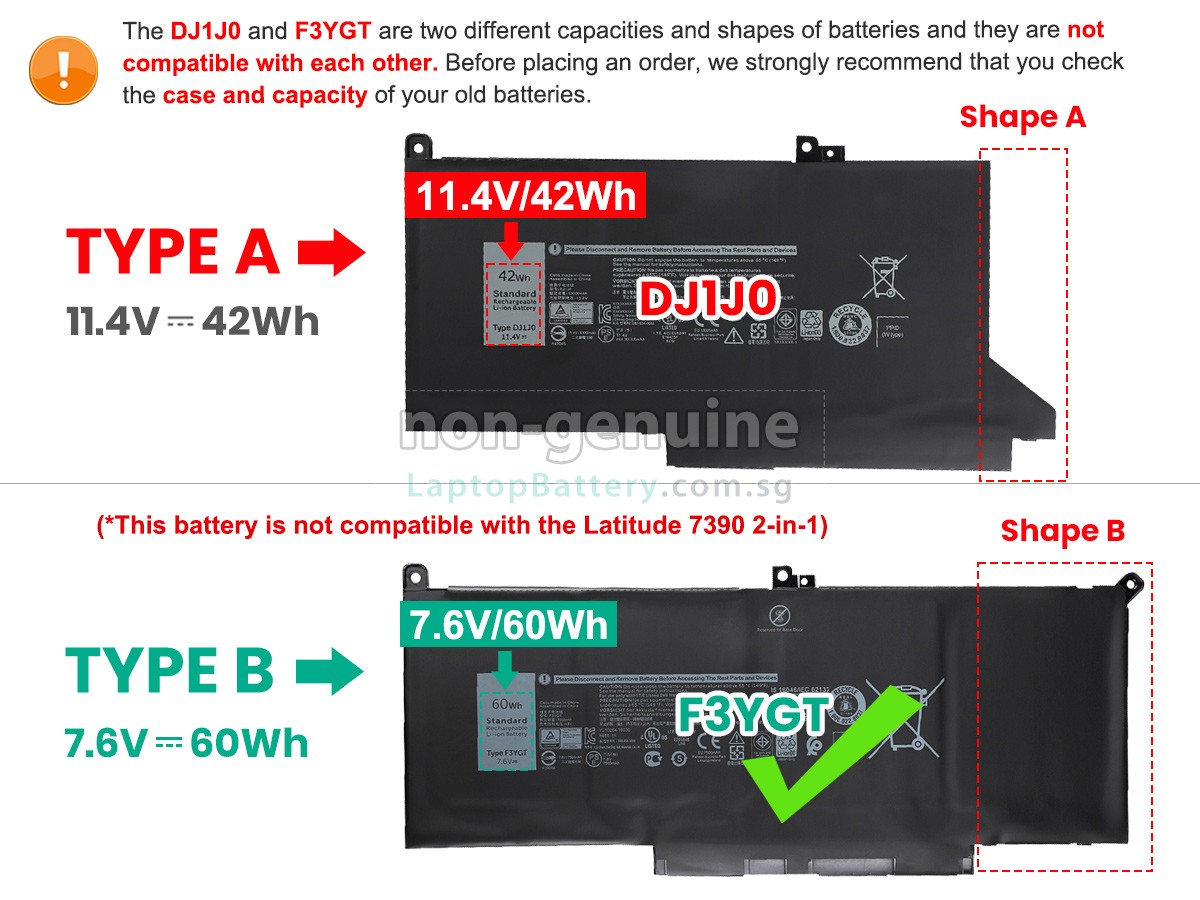 A: First, find out the part number of your old battery or the model name of your laptop (e.g. 'Dell DJ1J0') and match with our product compatibility table. Second, please compare the old battery with our product images to make sure their shapes are the same. Lastly, check the voltage (rating) is the same as the old one. For more details please click How to find one correct battery for my laptop?