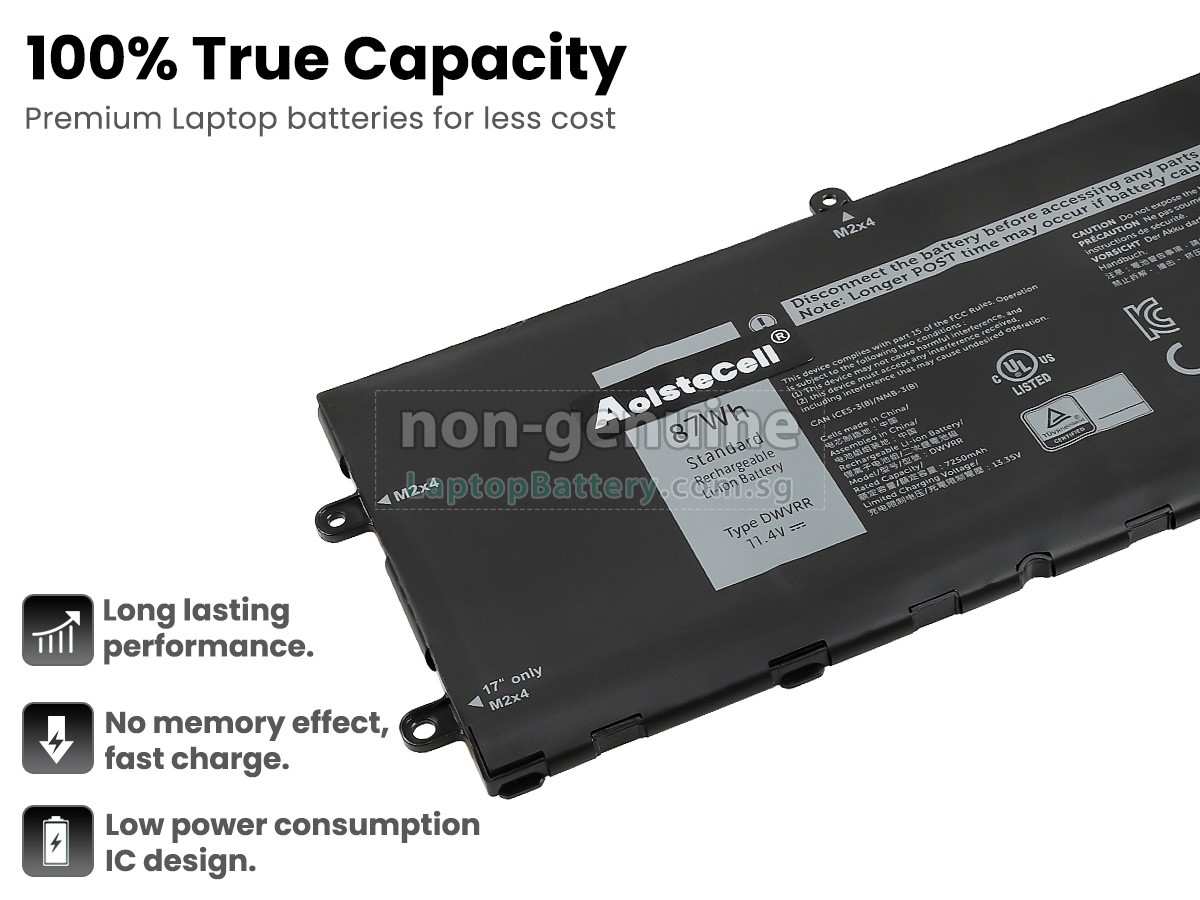 Buy with confidence! Our Website is your source for high quality Dell laptop batteries. This brand new 87Wh(6 cells) replacement Dell DWVRR Li-Polymer battery is made with high quality cells from Samsung. Each replacement battery for Dell DWVRR laptop has been tested on the Dell system before being dispatched and is 100% compatible with the original manufacturer's specification. When you buy our replacement Dell DWVRR battery, you're buying trust!