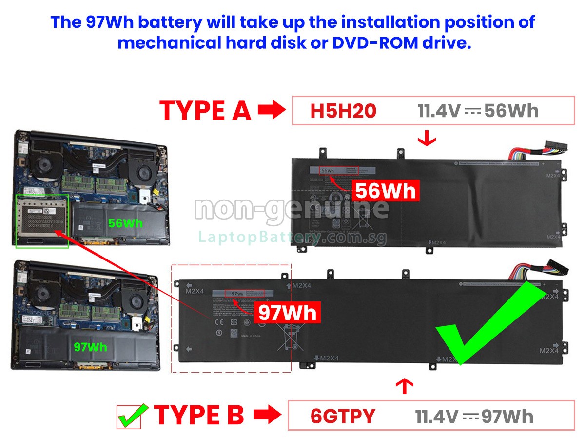 This is a high capacity(97Wh) battery,it's longer than the standard 56Wh battery, and it will take up the installation position of mechanical hard disk or DVD-ROM drive. You can use the 97Wh battery unless your laptop not installed the mechanical hard disk or DVD-ROM, otherwise please use the 56Wh battery.