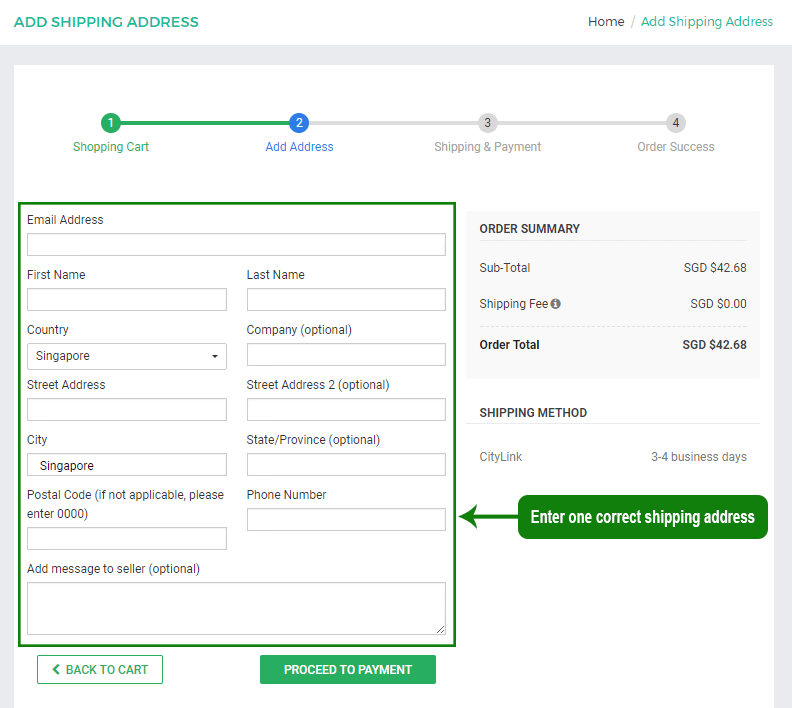 3The first checkout page is "Add Shipping Address",you can add or change shipping address, and enter "Special Instructions Or Comments" for your order. e.g. to an different dropship address.