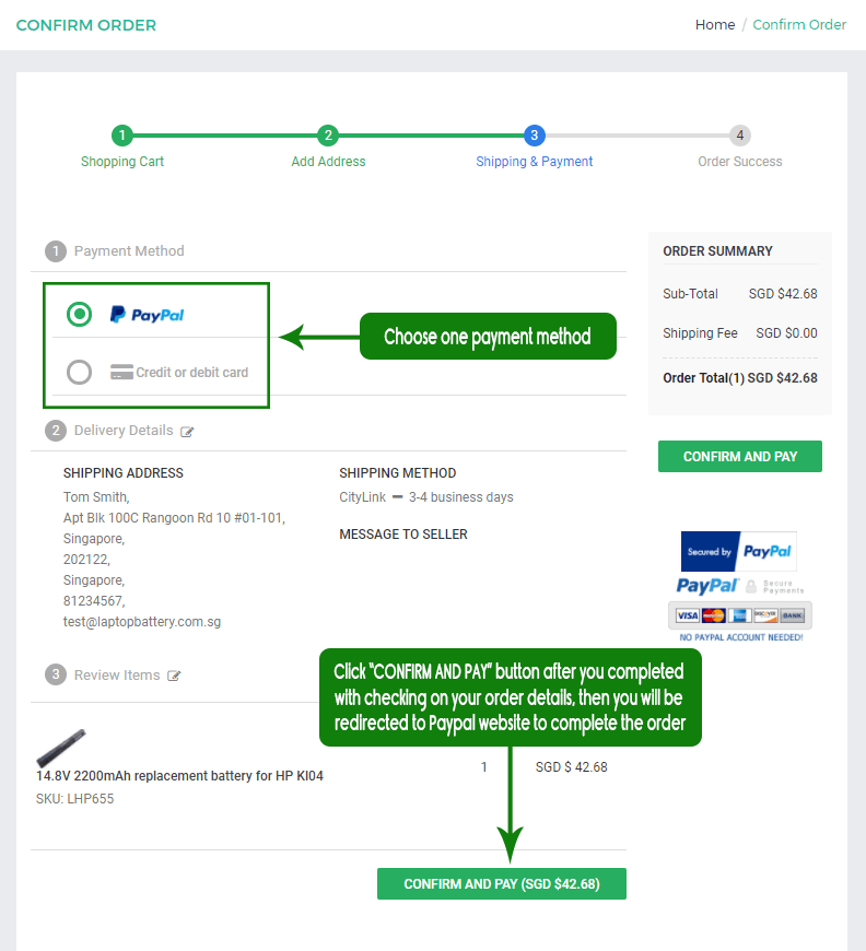 5Click "Confirm and pay" to create your order first and then be immediately directed to Paypal to complete your payment. You will receive an email confirming your order information.