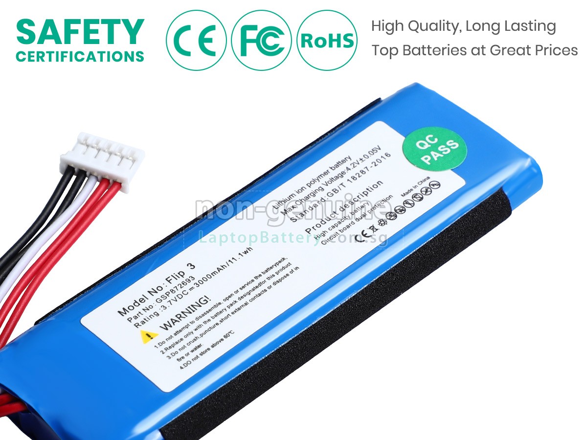 Welcome your patronage and thank you for purchasing this high quality replacement JBL GSP872693 speaker battery at Laptopbattery.com.sg! Before placing an order, please make sure that the part number of your old JBL GSP872693 battery is listed as below and has the same shape as our replacement GSP872693 battery's images (please view the larger images for details).