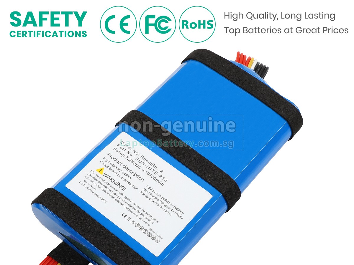 Buy with confidence! Our Website is your source for high quality JBL Speaker batteries. This brand new 72.6Wh(6 cells) replacement JBL SUN-INTE-213 Li-ion battery is made with high quality cells from Samsung. Each replacement battery for JBL SUN-INTE-213 speaker has been tested on the JBL system before being dispatched and is 100% compatible with the original manufacturer's specification. When you buy our replacement JBL SUN-INTE-213 battery, you're buying trust!