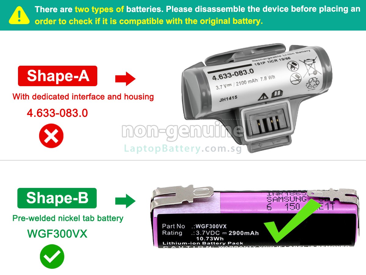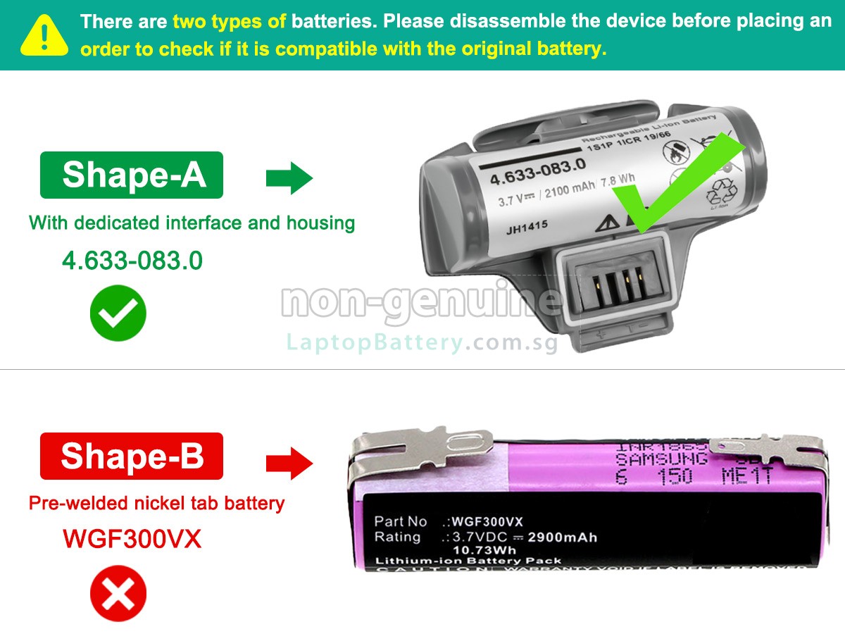 A: First, find out the part number of your old battery or the model name of your vacuum cleaner (e.g. 'Karcher WV2 PREMIUM') and match with our product compatibility table. Second, please compare the old battery with our product images to make sure their shapes are the same. Lastly, check the voltage (rating) is the same as the old one. For more details please click How to find one correct battery for my Vacuum Cleaners?