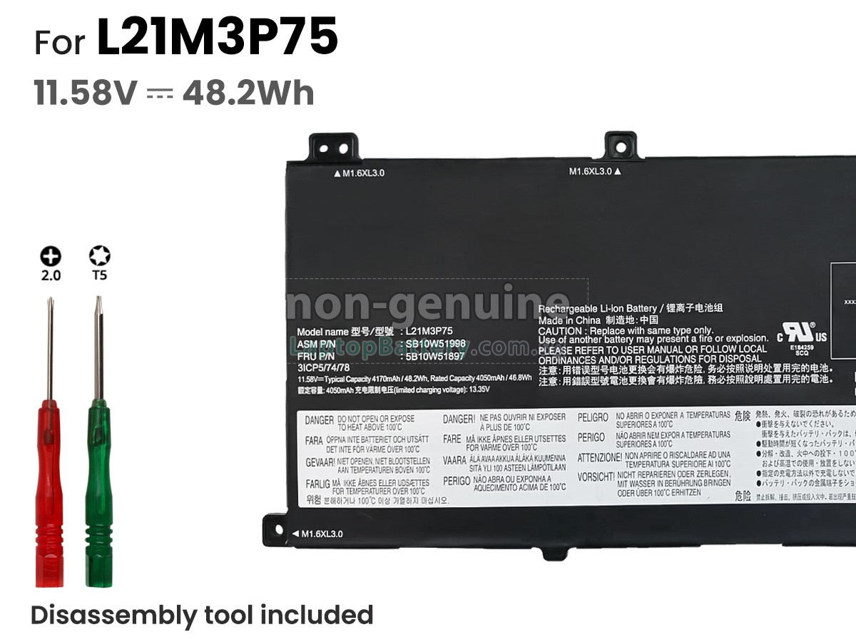 Buy with confidence! Our Website is your source for high quality Lenovo laptop batteries. This brand new 48.2Wh(3 cells) replacement Lenovo 5B10W51897 Li-Polymer battery is made with high quality cells from Samsung. Each replacement battery for Lenovo 5B10W51897 laptop has been tested on the Lenovo system before being dispatched and is 100% compatible with the original manufacturer's specification. When you buy our replacement Lenovo 5B10W51897 battery, you're buying trust!