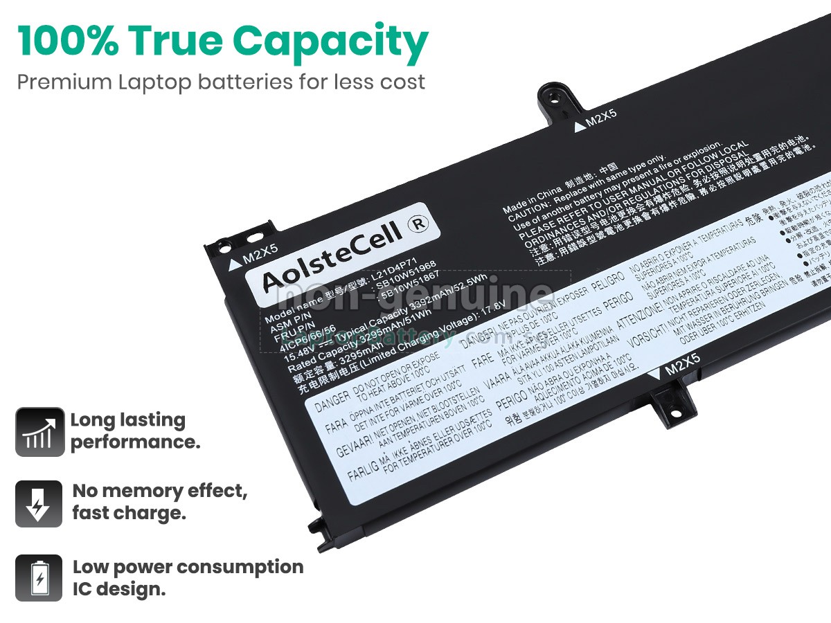 Buy with confidence! Our Website is your source for high quality Lenovo laptop batteries. This brand new 52.5Wh(4 cells) replacement Lenovo L21L3P71 Li-Polymer battery is made with high quality cells from Samsung. Each replacement battery for Lenovo L21L3P71 laptop has been tested on the Lenovo system before being dispatched and is 100% compatible with the original manufacturer's specification. When you buy our replacement Lenovo L21L3P71 battery, you're buying trust!