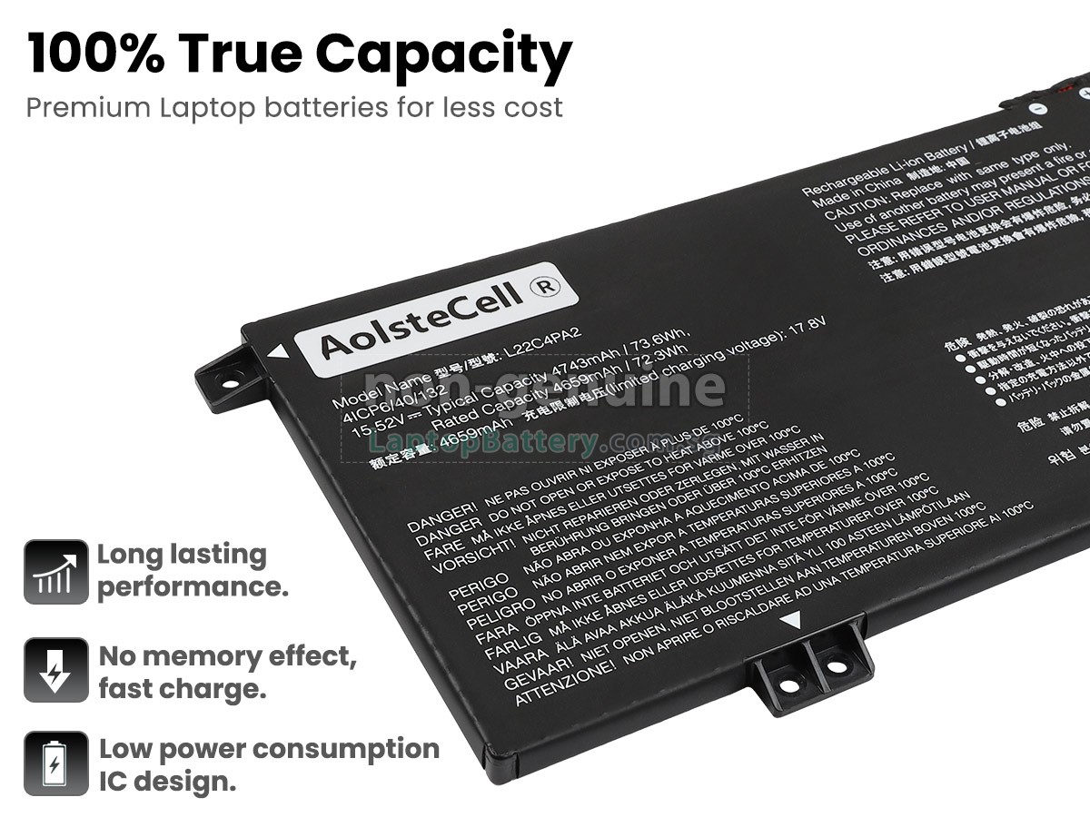 Buy with confidence! Our Website is your source for high quality Lenovo laptop batteries. This brand new 73.6Wh(4 cells) replacement Lenovo L22B4PA2 Li-Polymer battery is made with high quality cells from Samsung. Each replacement battery for Lenovo L22B4PA2 laptop has been tested on the Lenovo system before being dispatched and is 100% compatible with the original manufacturer's specification. When you buy our replacement Lenovo L22B4PA2 battery, you're buying trust!