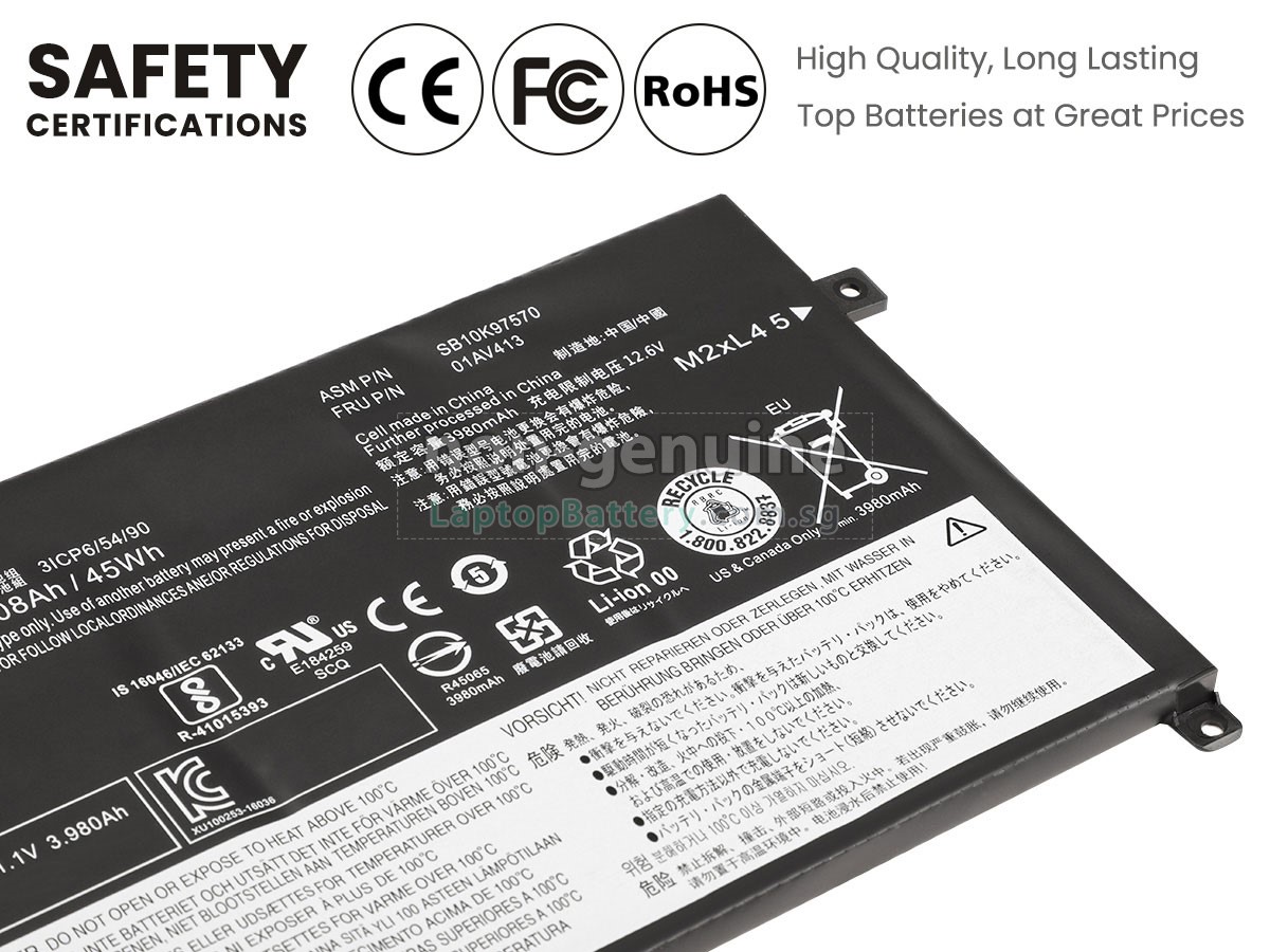 Buy with confidence! Our Website is your source for high quality Lenovo laptop batteries. This brand new 45Wh(3 cells) replacement Lenovo SB10K97568 Li-Polymer battery is made with high quality cells from Samsung. Each replacement battery for Lenovo SB10K97568 laptop has been tested on the Lenovo system before being dispatched and is 100% compatible with the original manufacturer's specification. When you buy our replacement Lenovo SB10K97568 battery, you're buying trust!