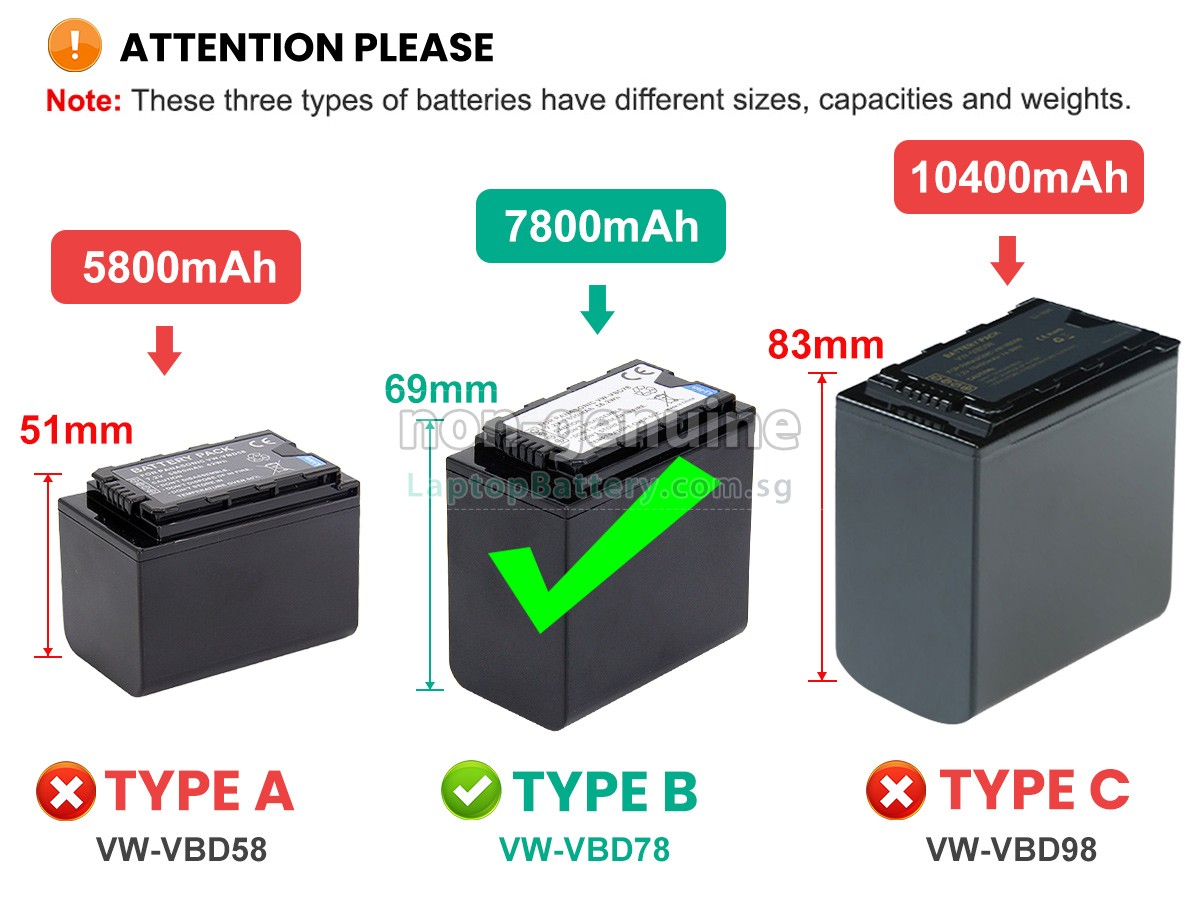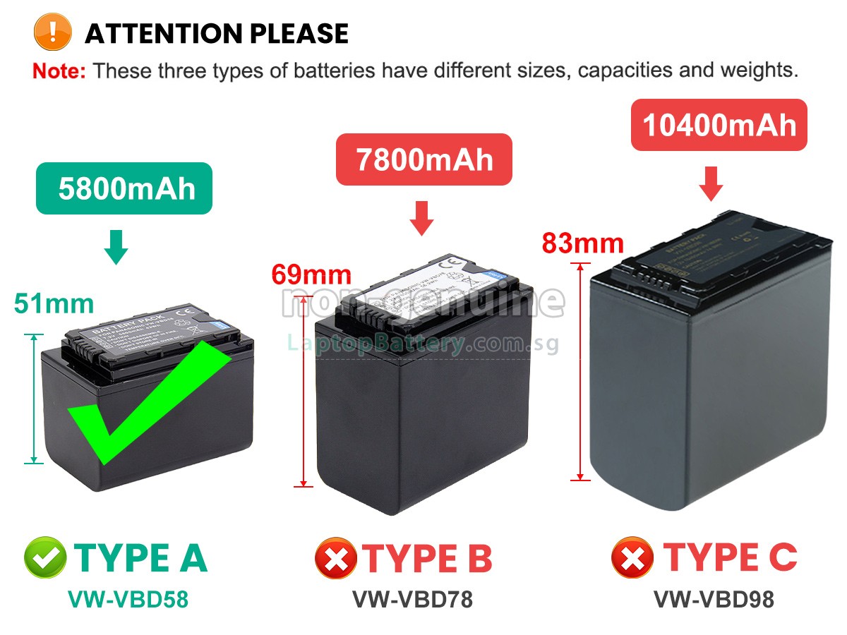 Welcome your patronage and thank you for purchasing this high quality replacement Panasonic AG-VBR59 battery at Laptopbattery.com.sg! Before placing an order, please make sure that the part number of your old Panasonic AG-VBR59 battery is listed as below and has the same shape as our replacement AG-VBR59 battery's images (please view the larger images for details).