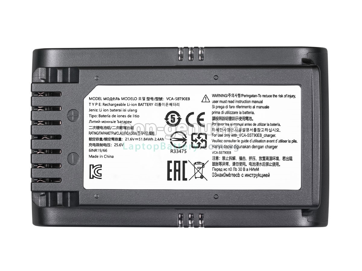 Buy with confidence! Our Website is your source for high quality Samsung batteries for Vacuum Cleaners. This brand new 51.84Wh(6 cells) replacement Samsung VCA-SBT90E Li-ion battery is made with high quality cells from Samsung. Each replacement vacuum cleaner battery for Samsung VCA-SBT90E has been tested on the Samsung device before being dispatched and is 100% compatible with the original manufacturer's specification. When you buy our replacement Samsung VCA-SBT90E battery, you're buying trust!