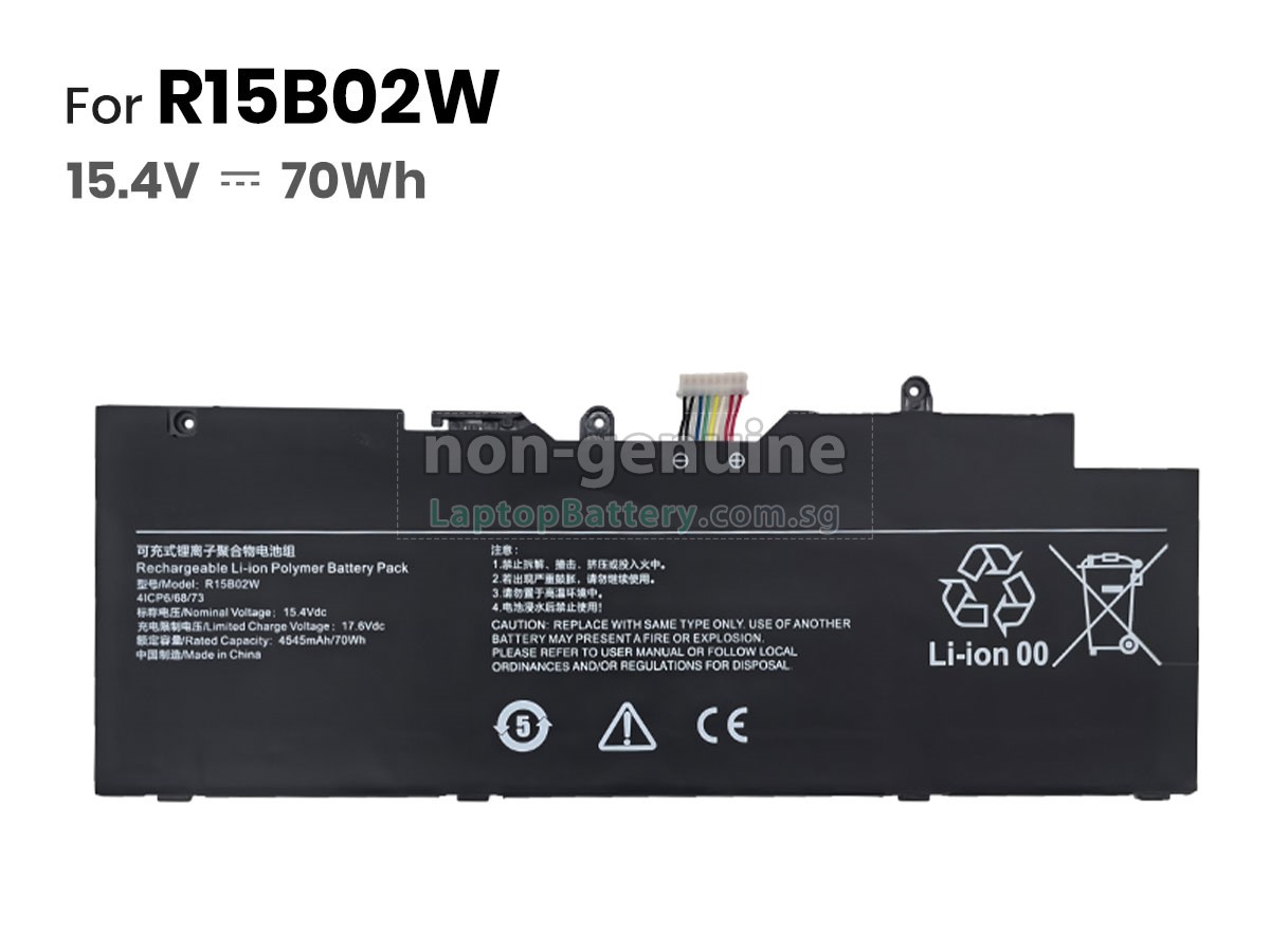 Buy with confidence! Our Website is your source for high quality XiaoMi laptop batteries. This brand new 70Wh(4 cells) replacement XiaoMi R15B02W Li-Polymer battery is made with high quality cells from Samsung. Each replacement battery for XiaoMi R15B02W laptop has been tested on the XiaoMi system before being dispatched and is 100% compatible with the original manufacturer's specification. When you buy our replacement XiaoMi R15B02W battery, you're buying trust!