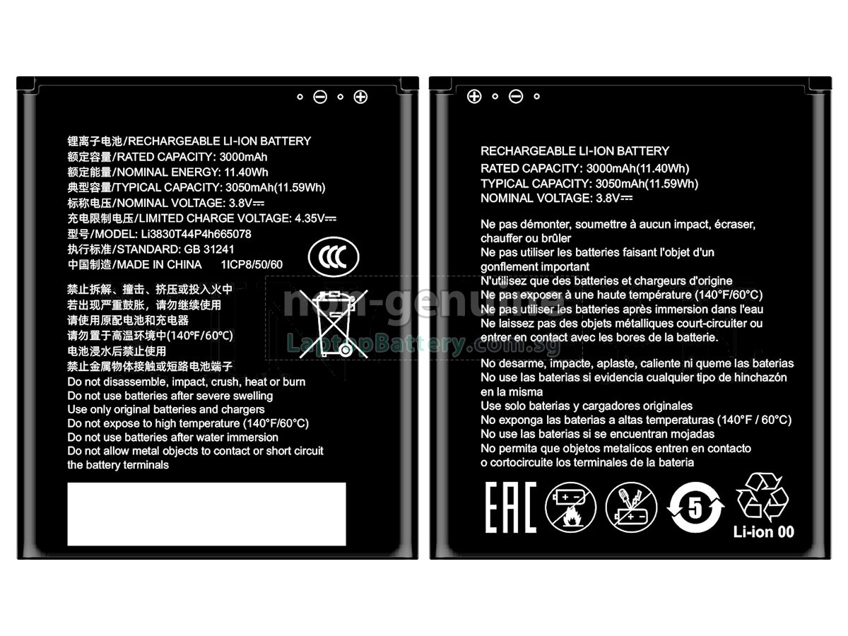 Welcome your patronage and thank you for purchasing this high quality replacement ZTE LI3830T44P4H665078 battery at Laptopbattery.com.sg! Before placing an order, please make sure that the part number of your old ZTE LI3830T44P4H665078 battery is listed as below and has the same shape as our replacement LI3830T44P4H665078 battery's images (please view the larger images for details).